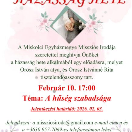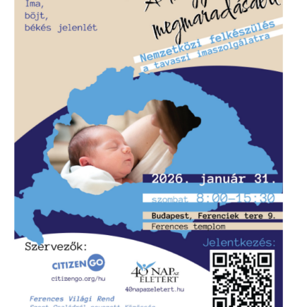 Közhírré tétetik! 40 Nap Az Életért – A magyarság megmaradásáért – Nemzetközi felkészülés a tavaszi imaszolgálatra időpont: 2026. január 31., szombat 8:00-15:30-ig helyszín: Budapest, Ferenciek tere 9. Ferences templom nagy közösségi terem Önköltséggel, magyar nyelven Ezen az eseményen szeretnénk tájékoztatást adni, arról hogyan és miben segíthet a 40 Nap Az Életért ima, böjt, békés jelenlét, a …